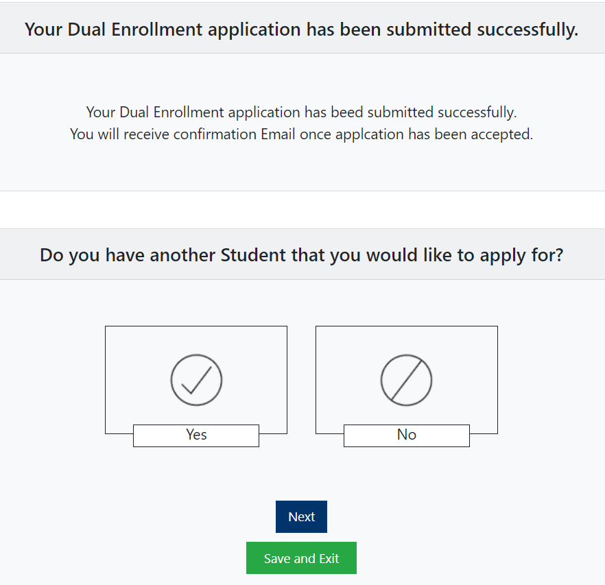 At the end of the submission process you will be asked if you have another student that you would like to apply for. If so, then you will select Yes and Next, and you will be taken back to the beginning of the process and prompted to enter your next student's state ID and birthdate.