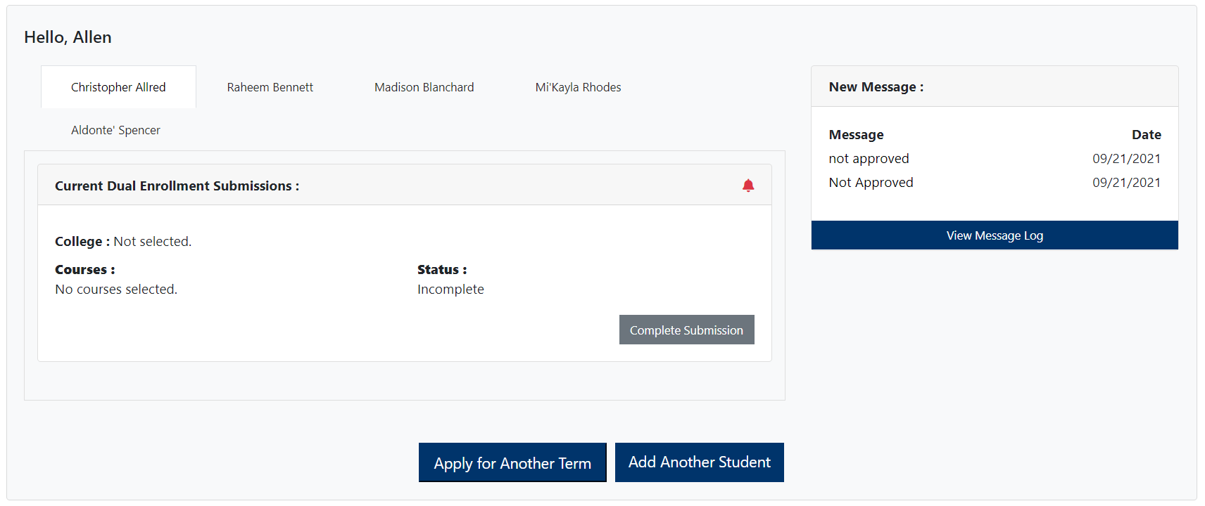 When you first register for a Dual Enrollment profile, you will be asked to add your student's state ID number and their birthdate. This will begin the submission process for your first student.